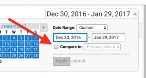 You can always make a chart and write down the values for the month. However, if you’d like to let Google Analytics do the comparison, click the down arrow where you set the date period, and check the “Compare to:” button.