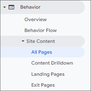 There are (fortunately and unfortunately) many different ways to get to the same data in Google Analytics. One of the easiest ways to see the bounce rate and the exit rate (or exit %) is by going to the left-hand navigation and clicking to the All Pages item under Site Content, under Behavior:
