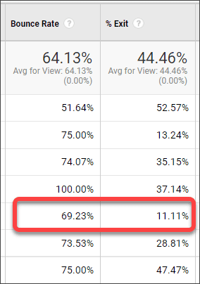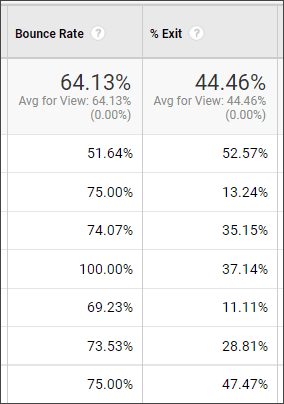 You will then see a table in the right-hand section that lists the pages on your website sorted by the number of sessions (a session is a visit to your website). If you look toward the right side of the table, you will see columns labeled Bounce Rate and Exit %. The purpose of this article is to talk about Bounce Rates, but it was important to contrast the Bounce Rate with the Exit % because the two measurements live next to each other in the table, and this placement can often be an area of confusion: