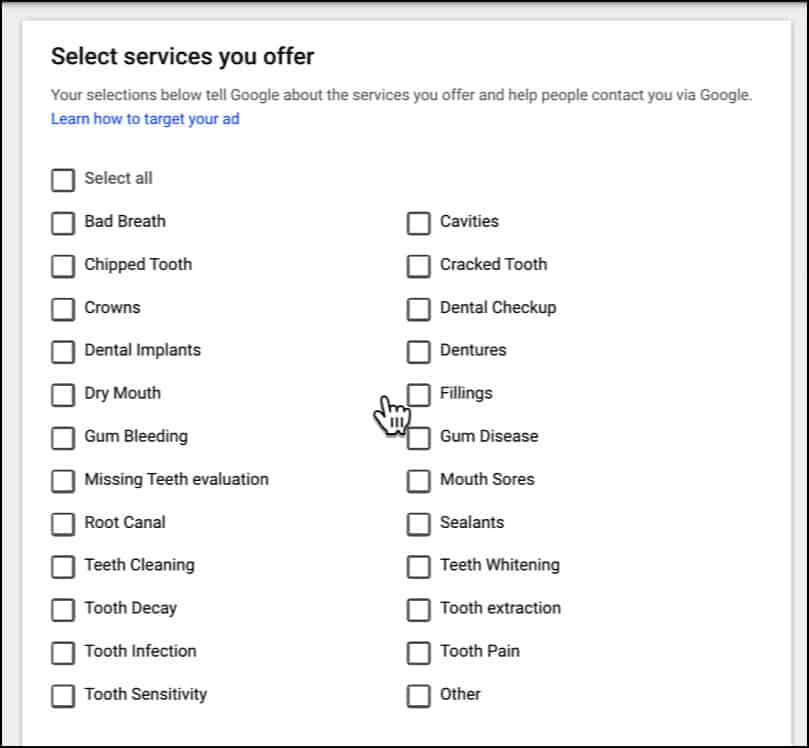 If you use Google Local Services Ads, your ad is shown at the top of Google search results when someone is searching for a dental-related service that applies to you. For example, if you checked off "tooth extractions" as a service that you provide during your account setup, your local services ad will have a better chance of showing up when someone searches for keywords related to tooth extractions vs. if you only selected "dental implants" or "root canal".