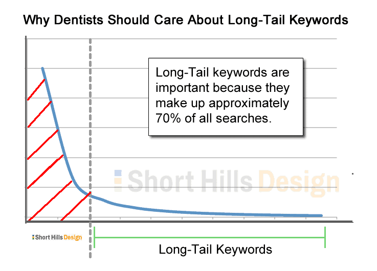 Examples of a long tail keywords would be. "what are the black lines around my crowns", "it is normal for kids to grind at night", "why do my gums bleed when I brush".  These are keywords that we would (generally) never pursue in an SEO campaign, yet can be very useful for driving traffic to your website (and hopefully new patients) because they are highly focused search terms, but have very low competition (one of the reasons we wouldn't pursue these keywords in a "real" SEO campaign is because the search volume is too low for each individual keyword).
