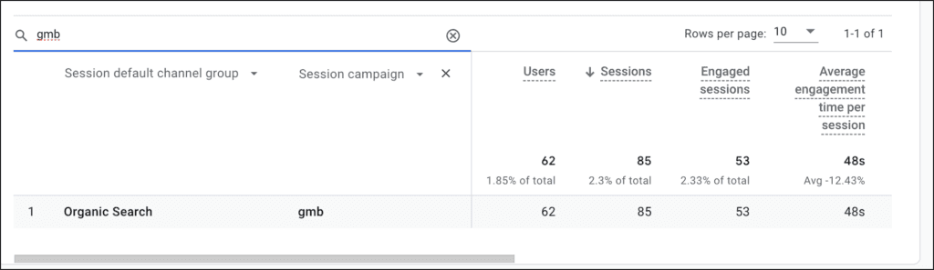 Once you have these tags in place you'll start to see GA4 data like in the sample below. In this screenshot we see that the session default channel is organic, and the campaign is "gmb". Now we can see how many new users and new sessions we have (along with a ton of other not-shown data) from GMB.