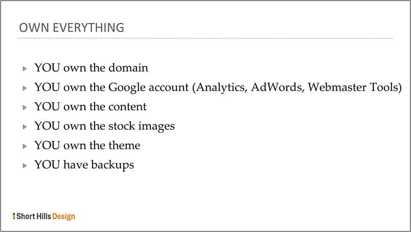 Here is a list of your website assets that you should own: your domain name, your hosting account, your website and content, your SEO and analytics data, your Facebook, Twitter and Pinterest accounts (where applicable).